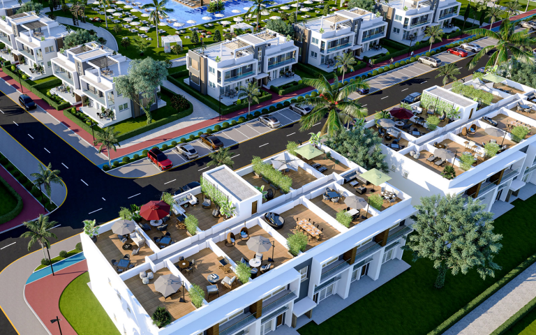 إنه مجمع سكني به بنية تحتية خاصة به وحدائق وحمامات سباحة وملاعب رياضية.